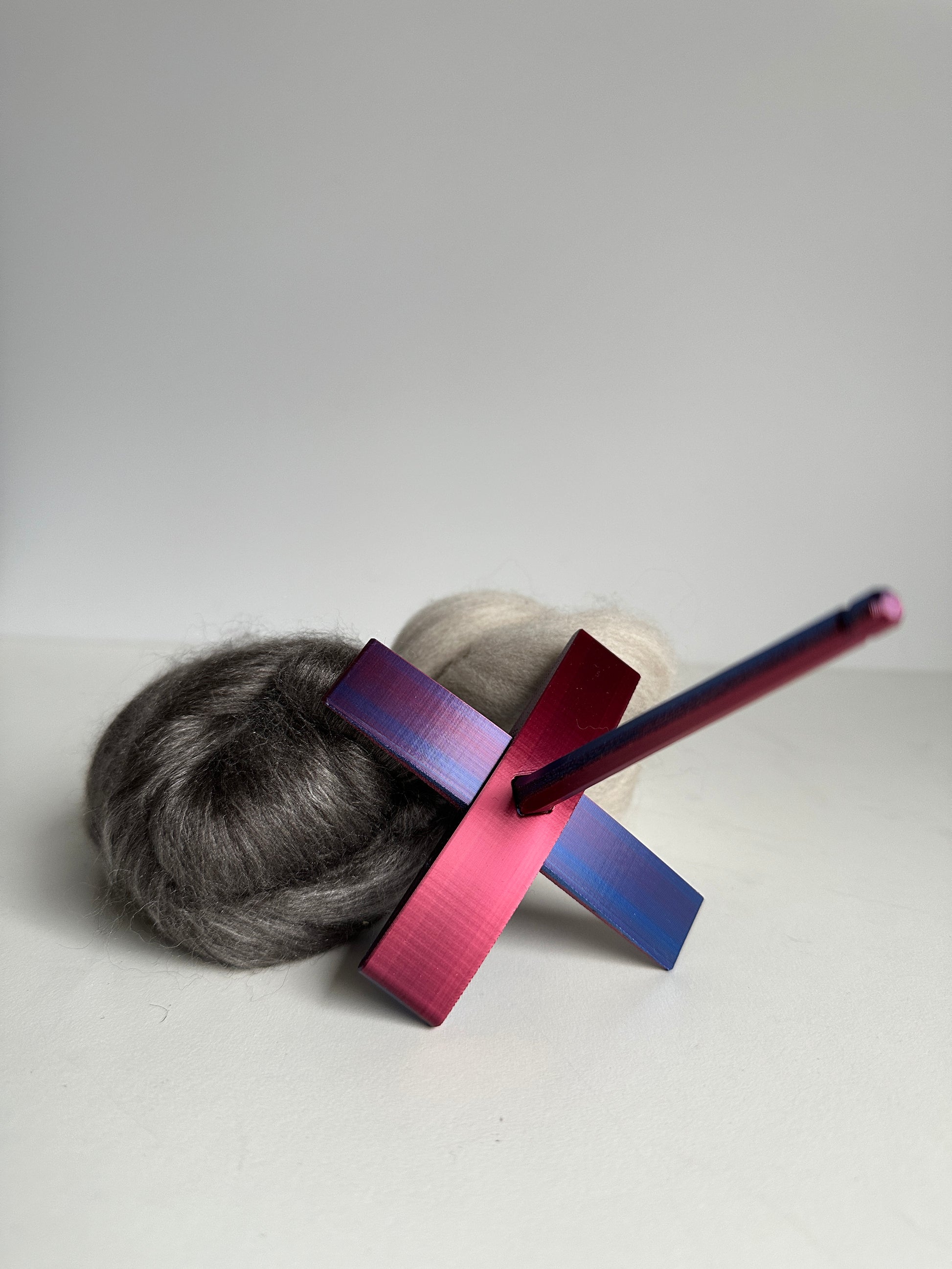 Ziggy is our first spindle, a so-called Turkish spindle, or cross spindle, with a bottom whorl in the form of a cross on which you can wind your yarn as you spin it. When you pull out the arms of the cross, you have a center pulled yarn ball from which you can ply directly.
