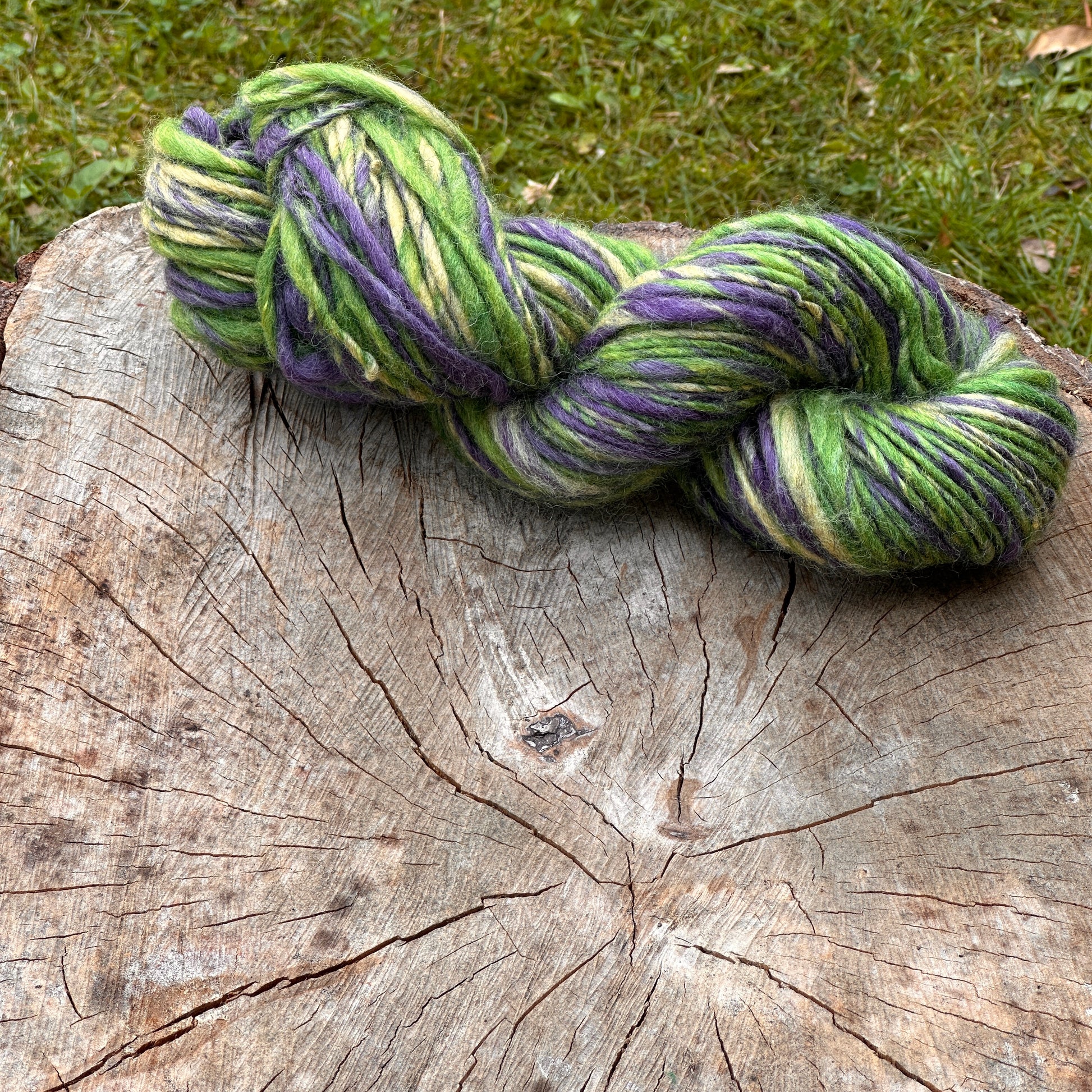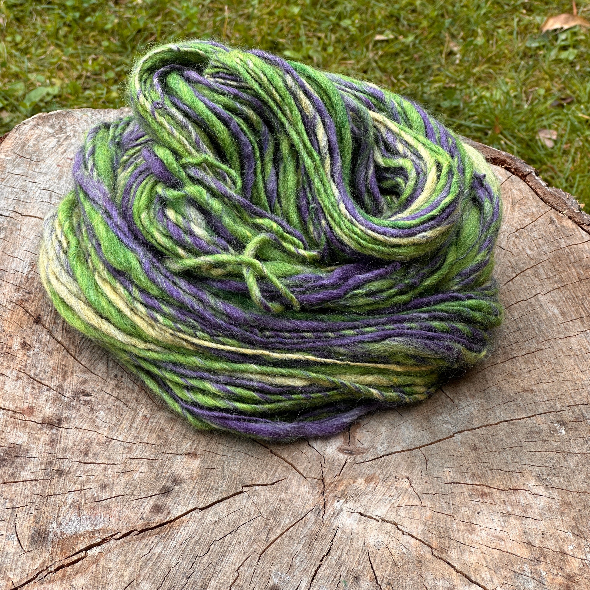 Handspunnet garn i ull med inslag av silke. Entrådigt, 102 m/ 89g.