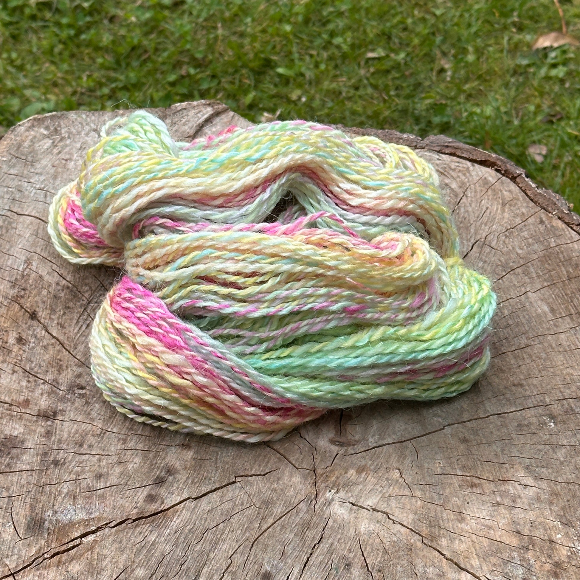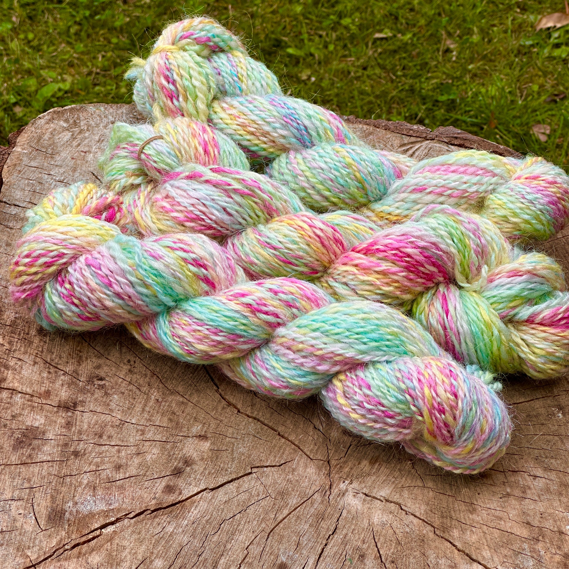 Handspunnet garn i Corriedale ull/nylon, 2-trådigt. Glansigt i ljuvliga färger. Finns tre härvor med varierande längd och vikt, se detaljerad beskrivning.