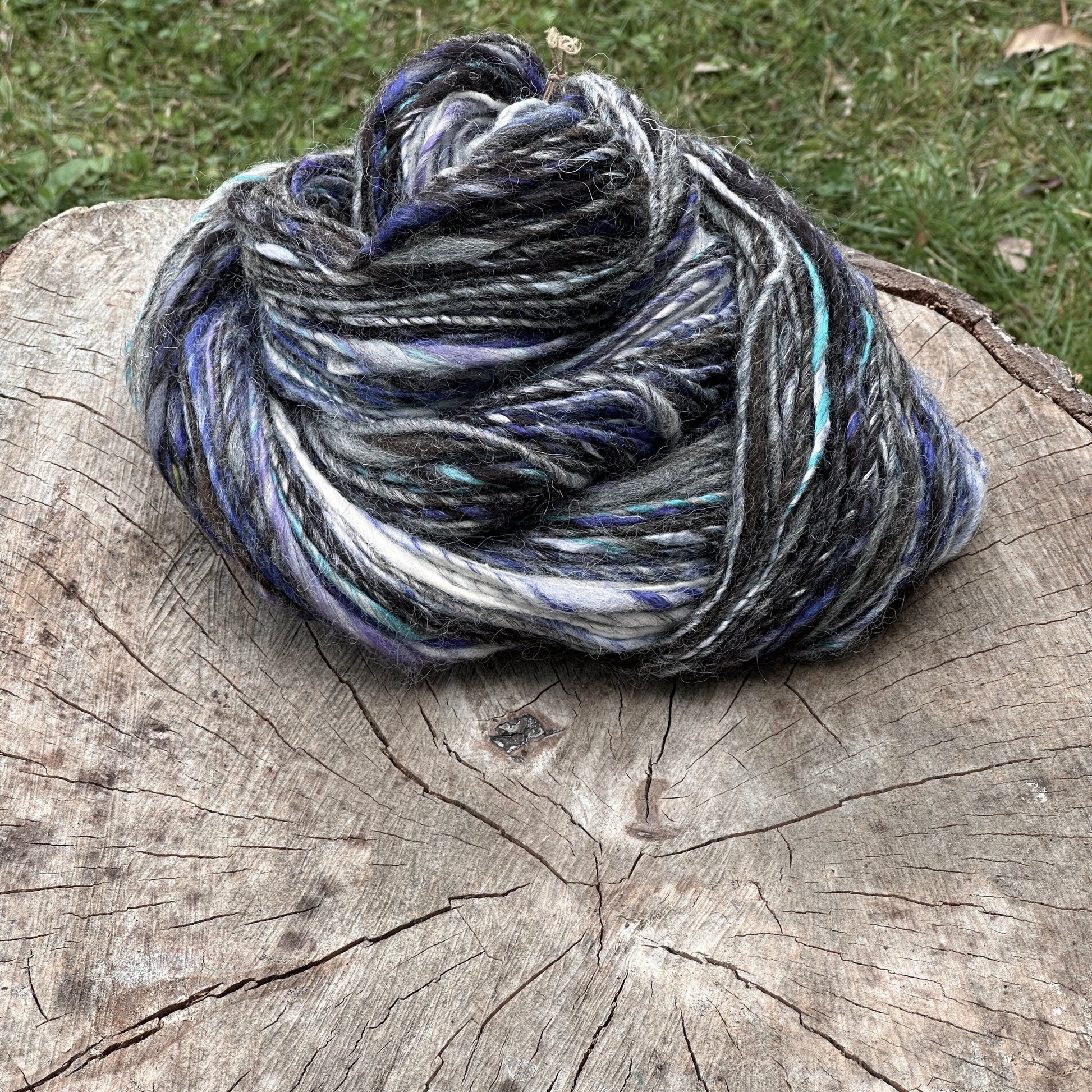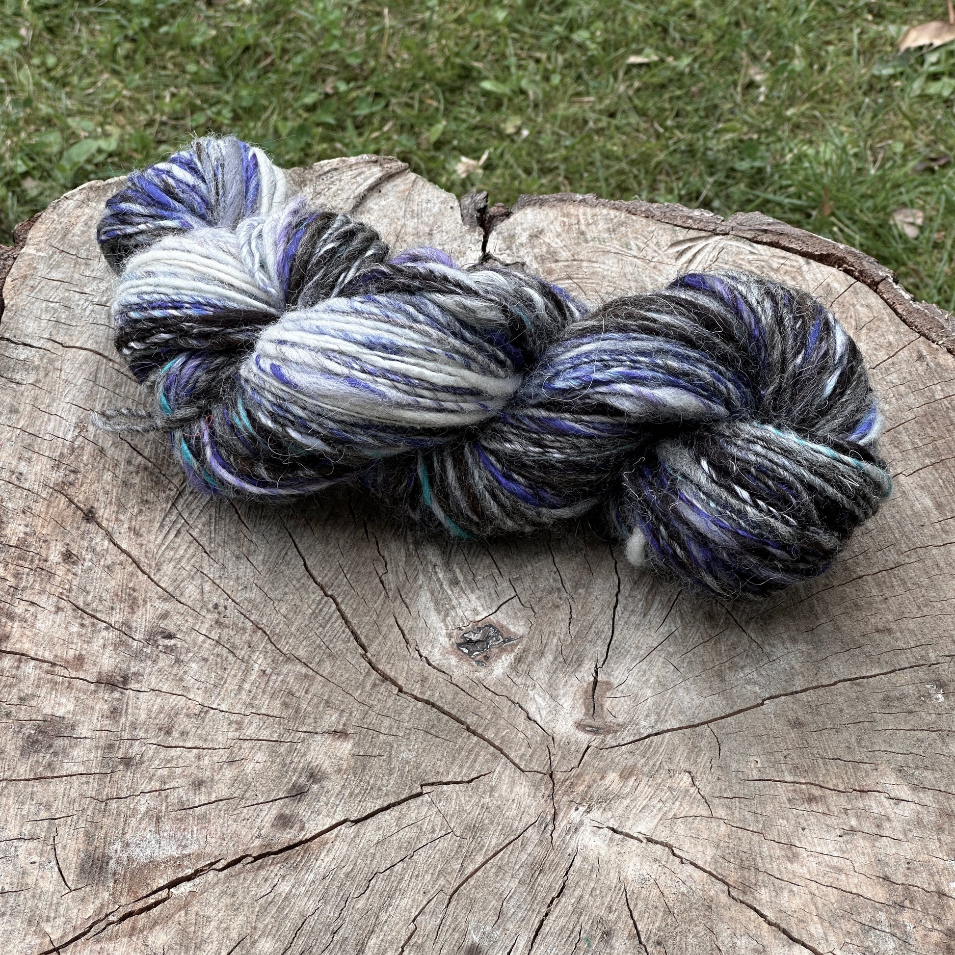 Handspunnet garn i en blandning av ull, silke och glitter. 1-trådigt, 156 m/ 96 g.